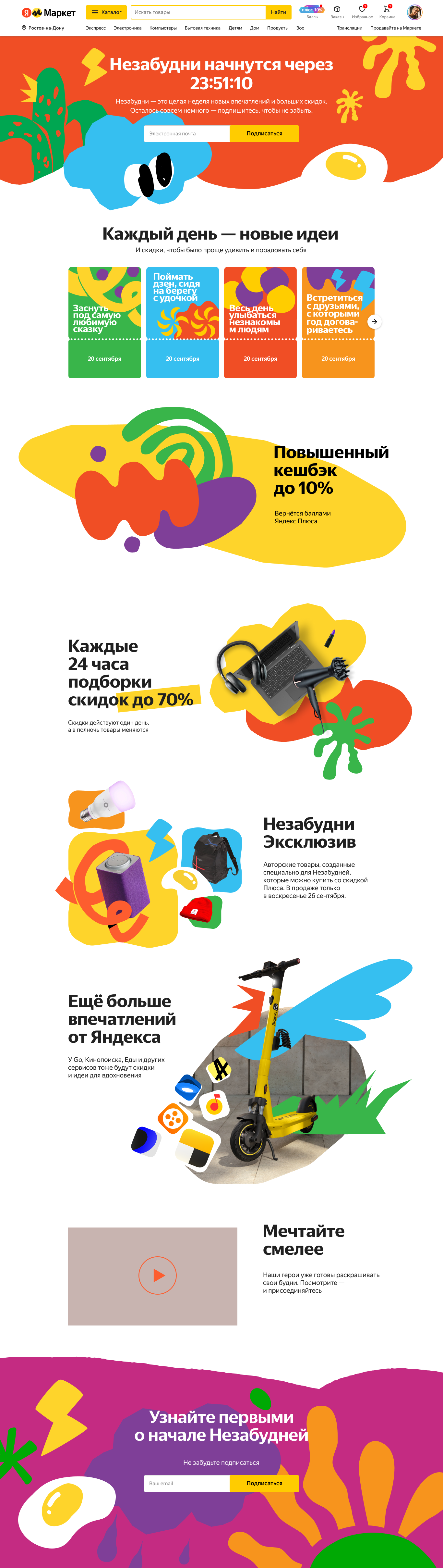 My goal was to create a new retail occasion for the whole Yandex ecosystem that would stand out from the usual discount driven communication and attract customers on a deeper emotional level. "An extra week of new experiences to break from the routine" was the idea we chose. The fully redesigned Yandex.Market was in the center of the campaign, but it involved more than ten other Yandex services, including taxi, food delivery, streamings, travel and many more making it the largest Yandex campaign ever.