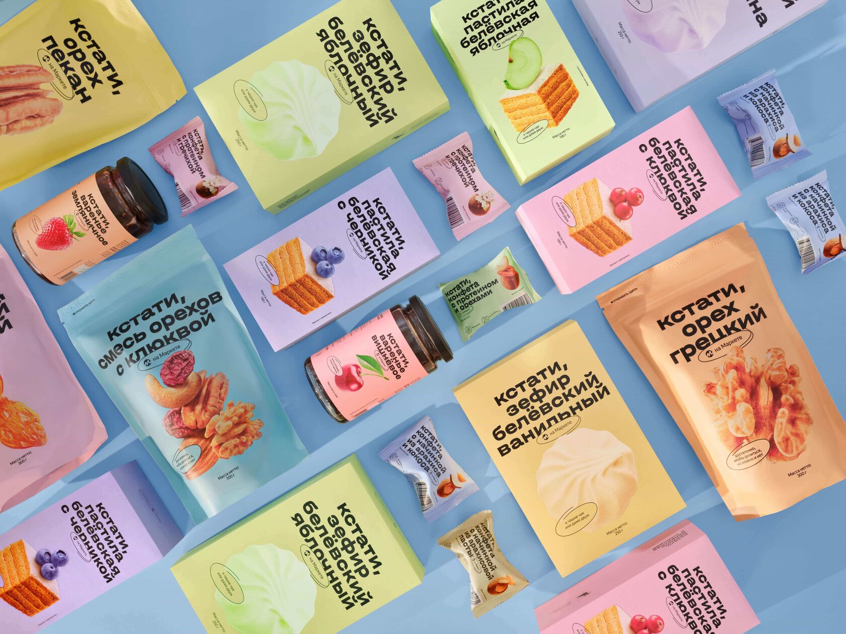 FMCG brand "Kstati" ("By the way") includes sweets, cookies, jams, and many more. To further develop the brand my team introduced a cartoon character featured on the packaging and in communication.